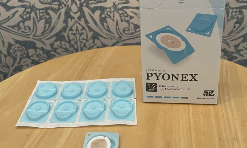 「PYONEX(パイオネックス)」のシール鍼です。針長1.2mmという短さが特徴で、円皮鍼(えんぴしん)と呼ばれるシール状の台座に極細の短い鍼が付いた、貼るタイプの鍼で、こんなに小さいものですが医療機器です。